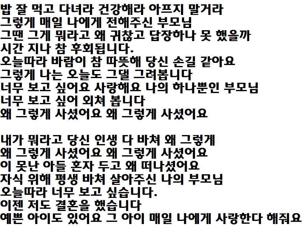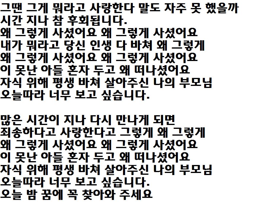 애절한 목소리에 부모님이 생각 나는 가사 게속 듣게 됩니다.